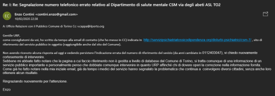 Riscrivo infine all’URP dell’ASL (in CC all’URP del Comune di Torino) domandando loro: “Come fare a vedere corretto quel numero telefonico, dal momento che neppure il referente del sito web indicato non fornisce alcuna risposta alle molteplici mie email? L’URP del Comune di Torino, da lei messo in CC, è stata la prima da me contattata, ma non ha trovato altra soluzione che quella di consigliarmi di rivolgermi all’URP della Regione Piemonte che, a sua volta, mi ha consigliato di rivolgermi a voi …. ☹”.
