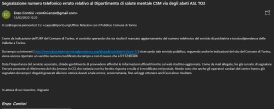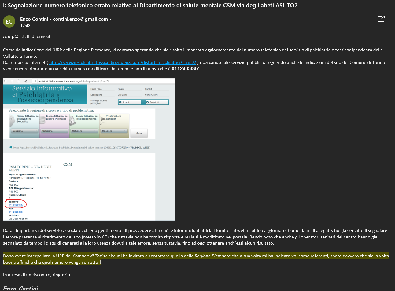 Si è così completato il giro (URP del Comune di Torino -> URP della Regione Piemonte -> ASL Città di Torino e infine di nuovo URP del Comune di Torino), ma inalterato rimane il numero errato di quel servizio pubblico presente sul sito servizipsichiatriatossicodipendenza.org , ripeto, generalmente trovato in prima fila con una ricerca su Google e che sembrerebbe relativo a una Onlus afferente all’Assessorato alla Sanità che è in capo alla Regione Piemonte!