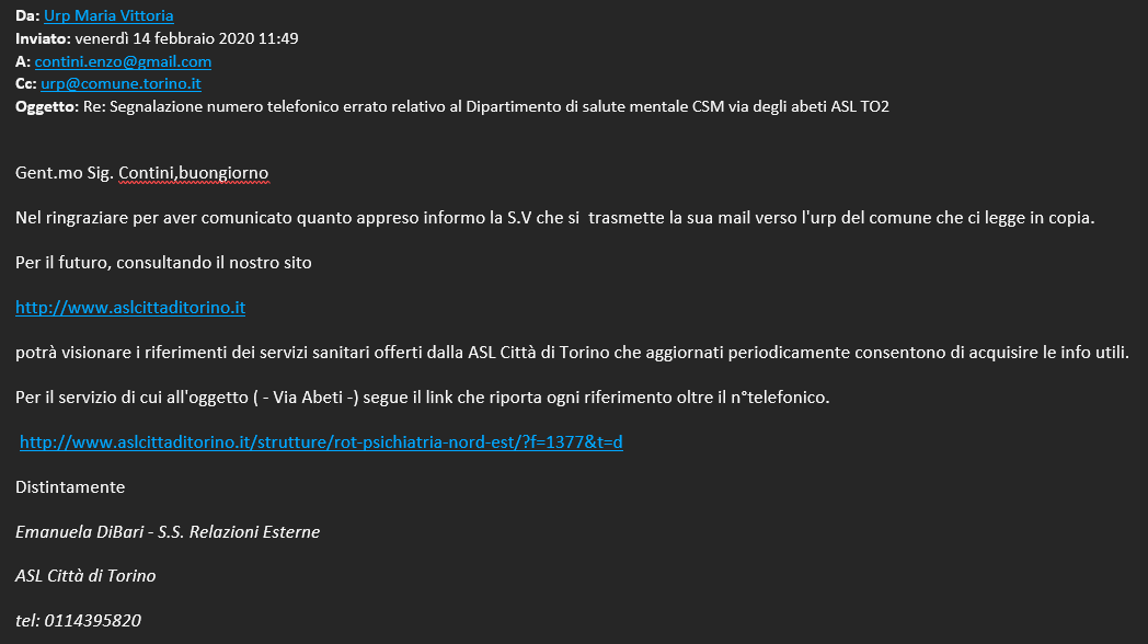 Speranzoso che finalmente venisse aggiornato quel numero telefonico, ricevo invece da loro la seguente email in cui, sostanzialmente, mi si invita ad accedere a un altro sito www.aslcittaditorino.it e specificatamente a una sua pagina relativa al servizio da me segnalato: là il numero telefonico è corretto. Lasciandomi basito, mi viene anche detto che hanno inviato in CC la mia segnalazione all’URP del Comune di Torino… vale a dire alla prima URP da me contattata!!