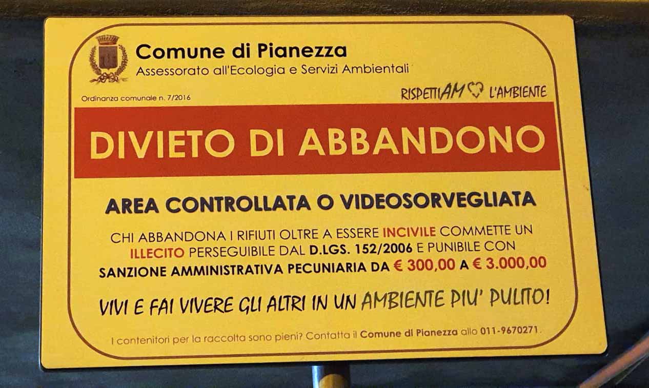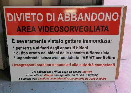 Inoltre, per quello che può servire per disincentivare certi comportamenti, fornisco il link di un progetto Photoshop relativo al seguente cartello di divieto di abbandono, in modo che se qualche persona o condominio desidera personalizzarlo, può scaricarselo e provvedere ad una sua stampa presso uno dei tanti servizi di stampa on line di cartelli anche su alluminio. Purtroppo di cartelli di divieto di abbandono non se ne trovano in giro di preconfezionati (ne esistono solo cartelli di divieto a fumare, a posteggiare ecc…) ed è necessario perciò farseli fare di personalizzati, con un costo non irrisorio di almeno 50€ ciascuno, o almeno così mi hanno chiesto i negozi a cui mi ero rivolto. Ovviamente tale cartello è da collocare in un’area video-sorvegliata, come infatti recita il suo testo, per sperare di ottenere l’effetto desiderato!