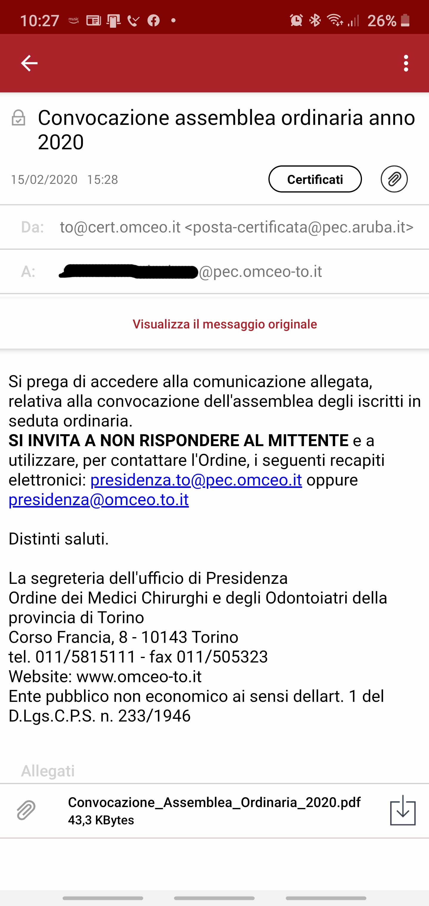 Configurando l’app Outlook non si riesce ad aprire l’allegato con il contenuto della email certificata