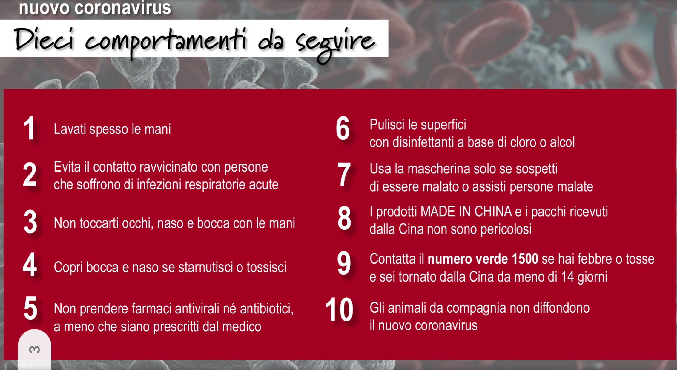 Inoltre è stato diffuso un Decadale dall’Istituto Superiore di Sanità che, in verità, dice ben poco se non smitizzare ovvie, benché possibili, false credenze (e.g. I prodotti Made in China o i pacchi provenienti dalla China non sono pericolosi; Gli animali da compagnia non diffondono il coronavirus)!!