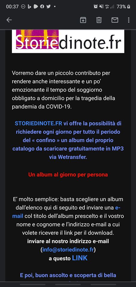 • “Un album al giorno per persona”: bellissima iniziativa della casa discografica alternativa Storie di note che consente di richiedere gratuitamente via email l’invio di diversi album in mp3 a scelta dal suo catalogo: un piccolo regalo per incontrare la musica d’autore italiana di qualità nelle vostre giornate di confino per il COVID-19.