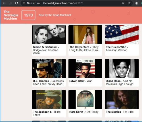 • The nostalgia machine che consente, selezionando un anno specifico, di avere un ampio elenco di bani hit di quell’anno e di ascoltarli e vederli (si tratta infatti di video estratti da sistemi di condivisione in rete di contenuti multimediali). Per anni recenti esiste anche l’analogo The Kpop Machine.