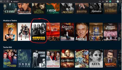 • Sezione Teatro e Concerti in RaiPlay, contenente diversi concerti. Segnalo in particolare una esibizione dei primi Genesis (1973) che suonano canzoni del loro disco Nursery Crime. Un documento prezioso ripescato dagli archivi della Cinémathèque Royale del Belgio. Con Peter Gabriel in piena forma giovanissimo … come d’altra parte tutti!! Insomma, DA VEDERE!!!