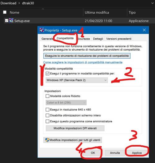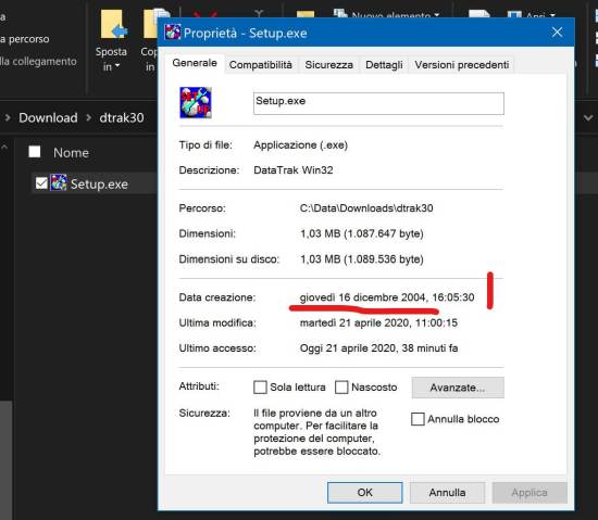 Because on that year there was Windows XP (version with service pack 2), the Setup of that SW it is better to be performed setting the compatibility mode as follows (right click on Setup.exe and select the Properties item in the list):