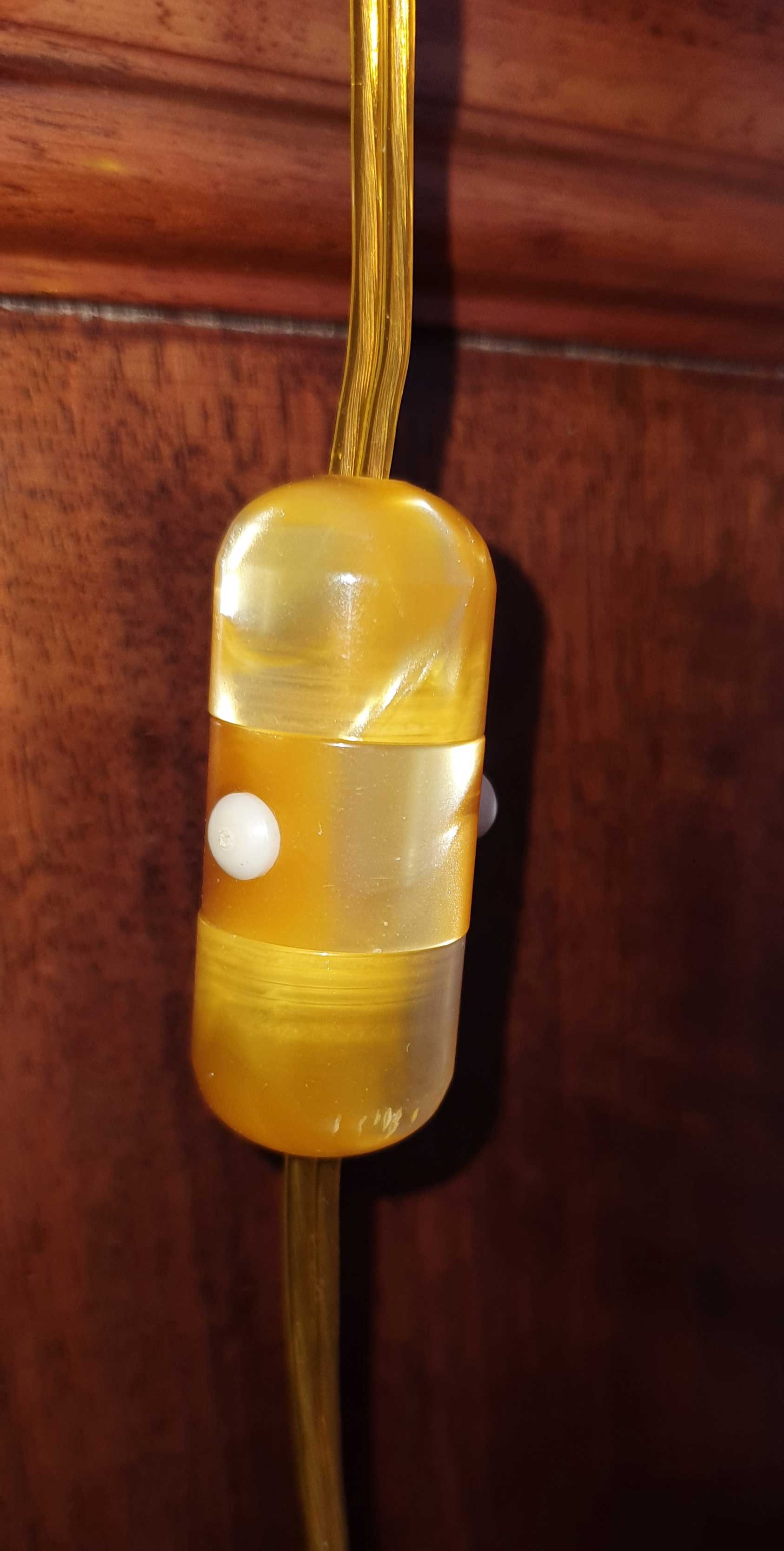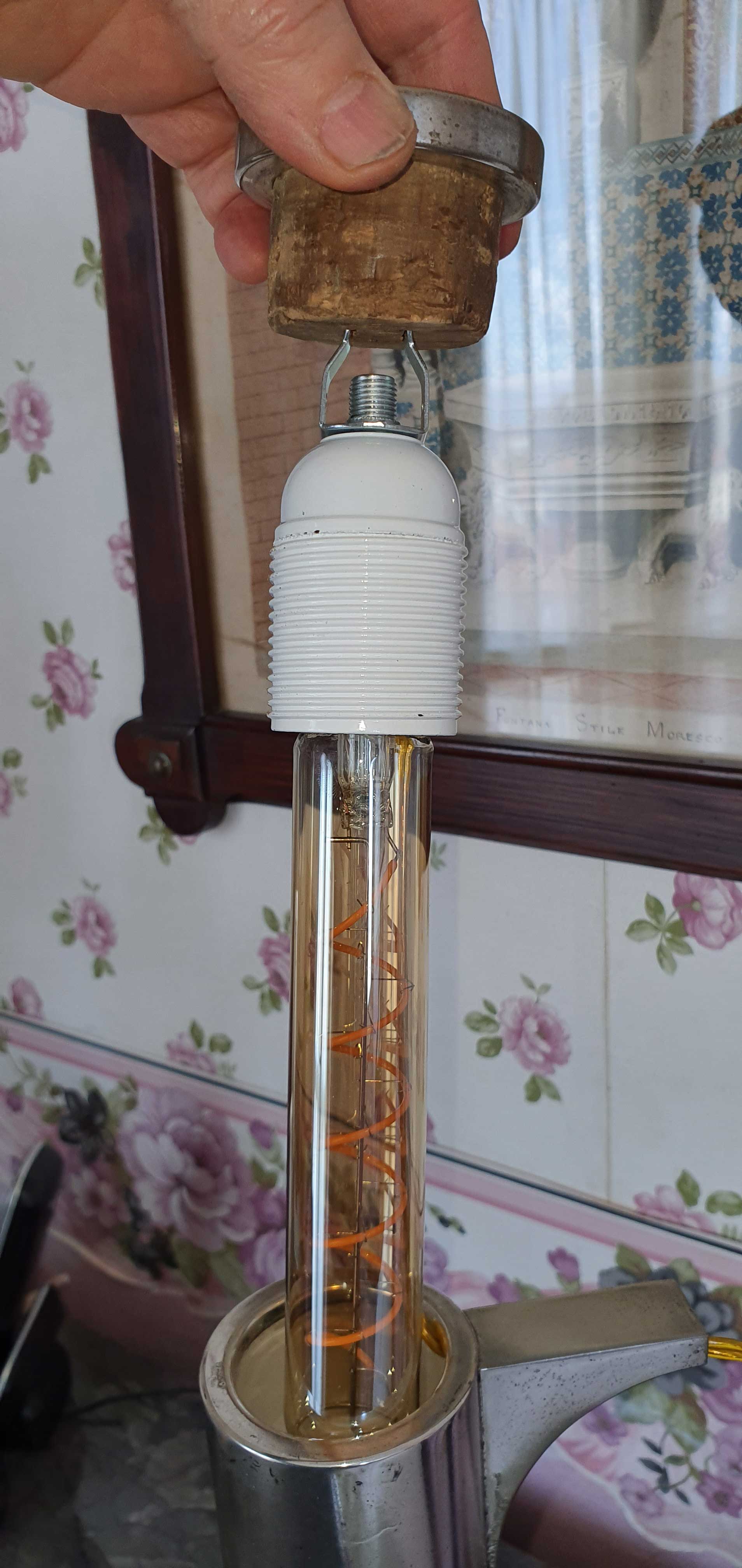 Il gancio per appendere il portalampada l’ho tolto, rotella inclusa, in modo da avere solo due spuntoni da conficcare nel sughero del tappo. - Lampadina di design (io ho preso la bella lampadina lunga, con una luce calda ed ideale per un comodino o un angolo del salone, Tianfan T28 185 mm spirale LED Lampadina vintage tipo lampadina 4 W 220 V, dimmerabile, attacco E27 [Classe di efficienza energetica A++])