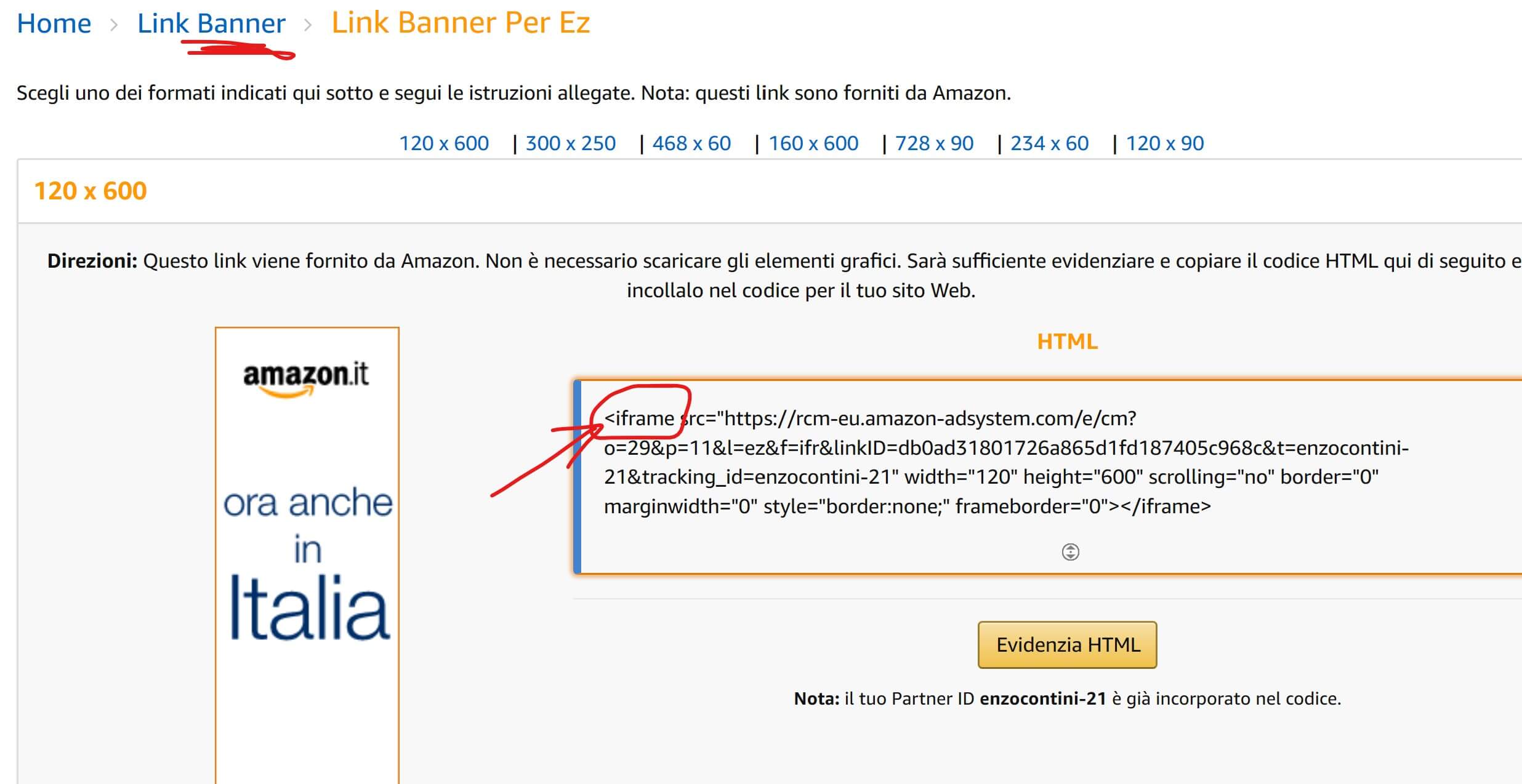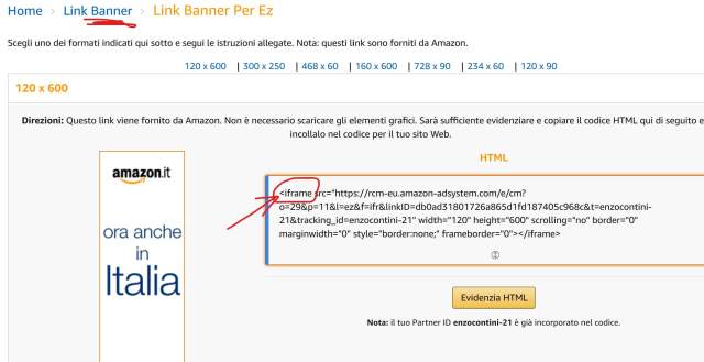 The second menu item is related to the creation of link to product/pages or of banner [IT: Creazione link prodotti]. The best way to add some Amazon advertising would be to add a banner handled by Amazon itself, so choosing the second Banner choice. However, as already stressed, you will notice that this requires adding to your site some html that contains the iframe tag … and this is not allowed for cheaper WordPress plans. In fact, if you try to copy one of the suggested codes in one of your posts when you save it, all that code is automatically deleted because considered not valid!