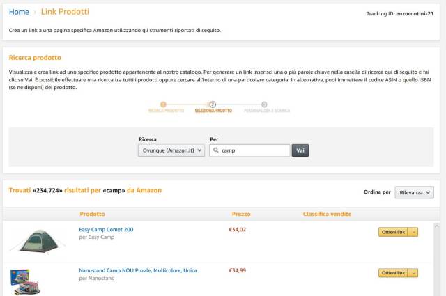 When you find the product you want to promote, you have to click on the Get link [IT: Ottieni link] button or click on its arrow to get only that product URL: