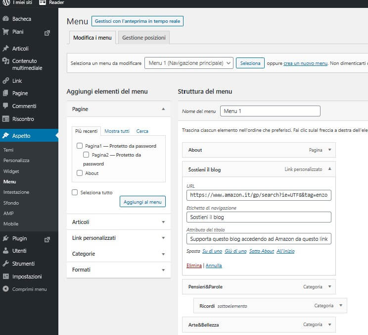 In this way, when someone clicks that Support this blog [IT: Sostieni questo blog] menu item it will be redirected to the Amazon homepage: