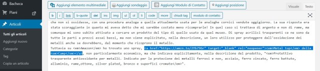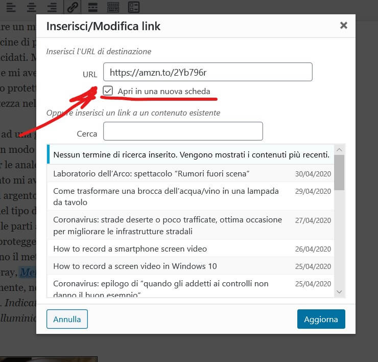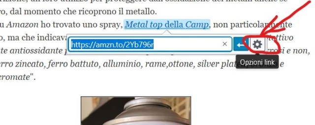 For example, I added a link to a link to the Metal Camp spray in my post related to How to protect a metal object from oxidation. I created, from the Amazon affiliate site a link to that product I bought and used, then I created a link when I described how I used it, taking in mind to click in the options link in order to check the Open it in a new tab [IT: Apri in una nuova scheda] checkbox: