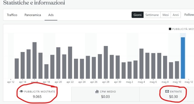 By now I can say that yesterday on embedded WordAds, with 9000 advertising views (a lucky day), they paid me 0.30 euros: