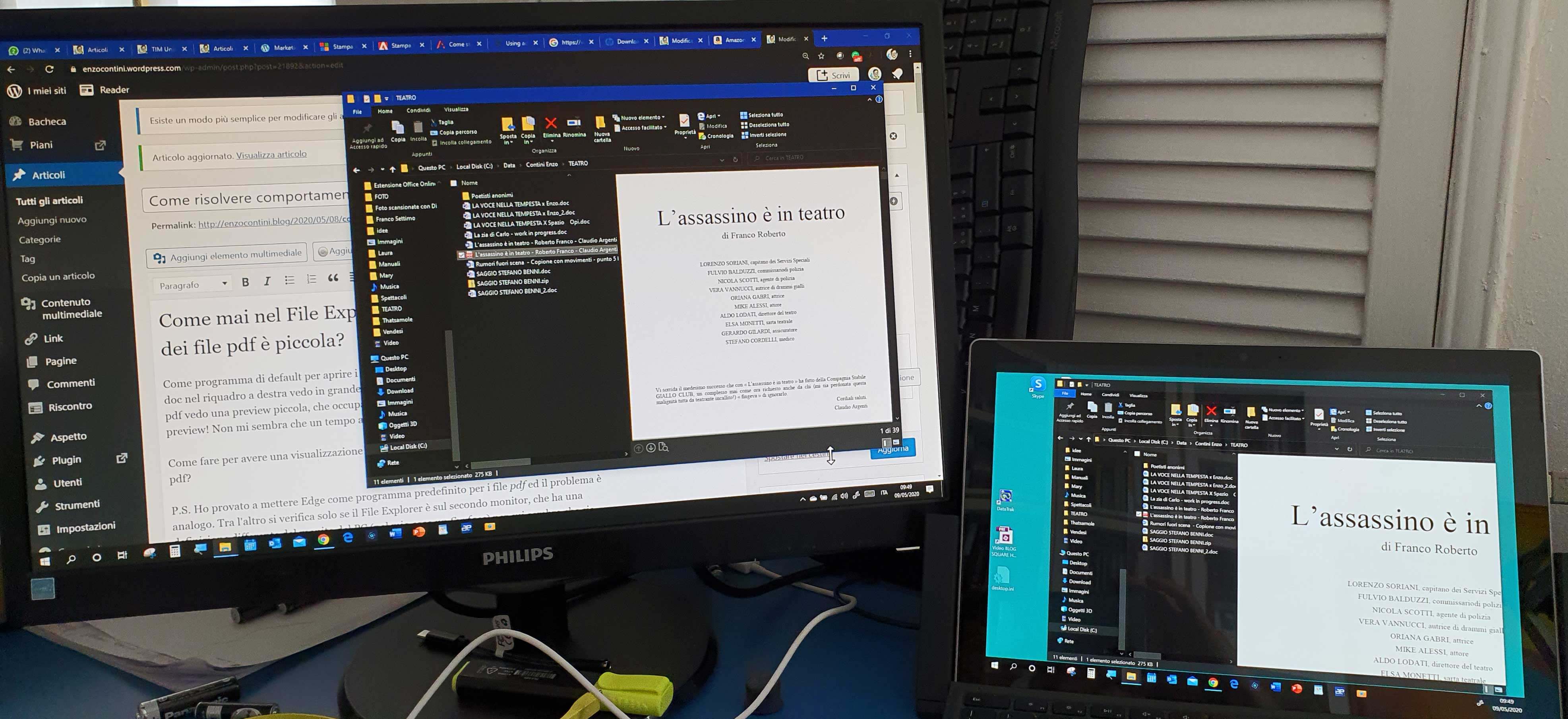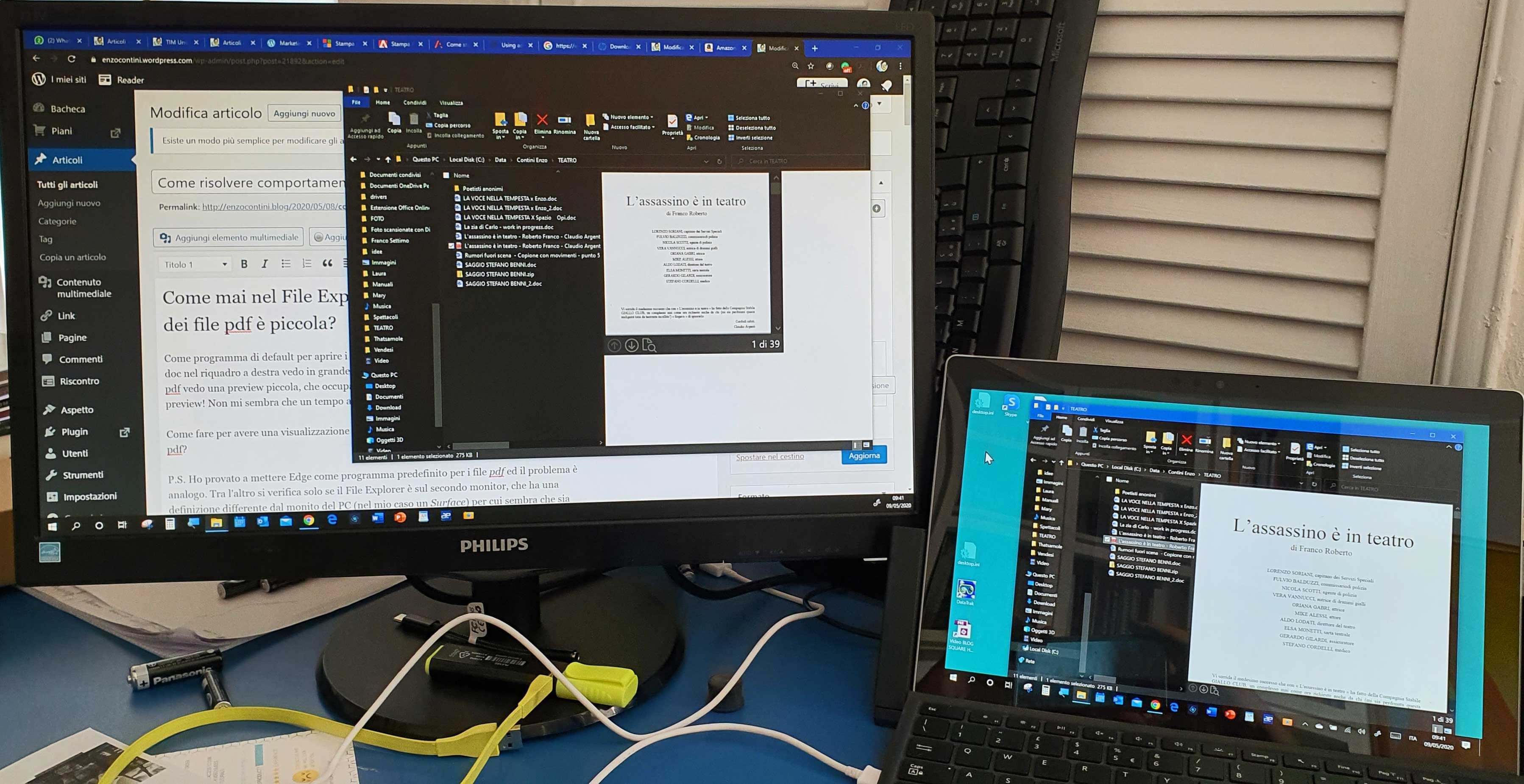 As you can see, on the external monitor there the anomalous display behavior persists but it is less evident (e.g. pdf file preview is little, but not more so much). Because of the screen size of the Surface, the set 1920 x 1200 resolution implies that two few millimeters unusable strips, one on the top and one on the bottom, while with the previous highest recommended 2736 x 1824 resolution all the screen was taken. - Secondary display on Surface PC at 1920 x 1200 resolution and screen size 200%; Primary display on Philips monitor at 1920 x 1080 (recommended) resolution and screen size 100% (recommended).