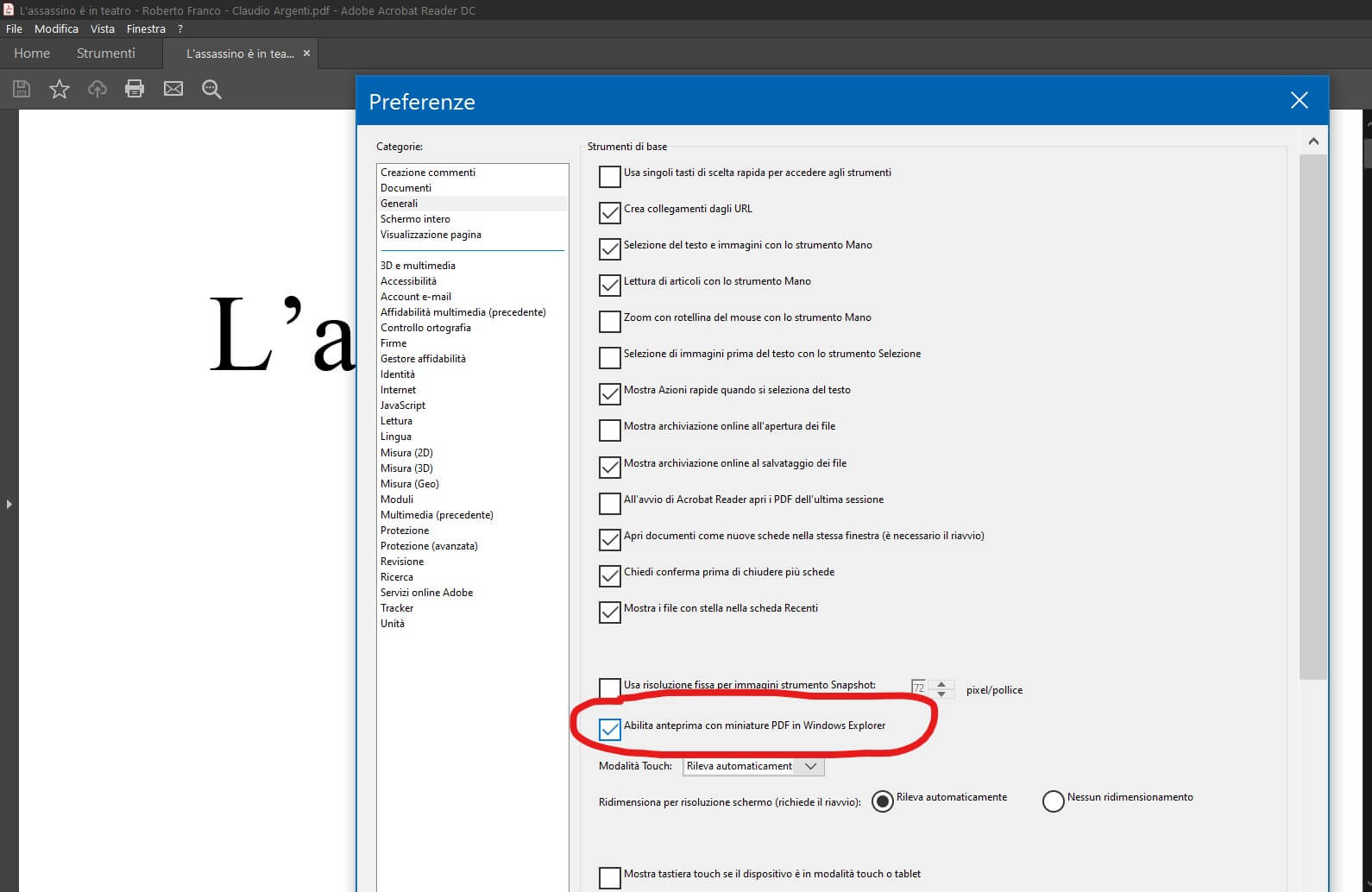 For example, if you are using Acrobat Reader DC as the default program for pdf file, you can try to set “Enable preview with PDF thumbnail in Windows Explorer” [IT: Abilita anteprima con miniatura PDF in Windows Explorer] option in its Preferences [IT: Preferenze] section: