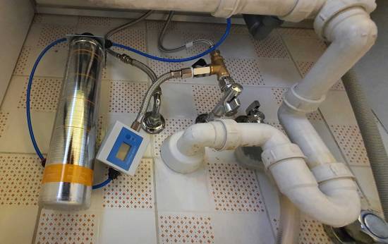 Si noti che il tubo blu ha una sezione molto ridotta rispetto ai classici tubi dell’acqua presenti nel sottolavello, per cui è necessario utilizzare i raccordi forniti, seguendo lo schema di collegamento presente in un foglio allegato: la foto seguente del mio sottolavandino penso mostri chiaramente come collegare il tutto.