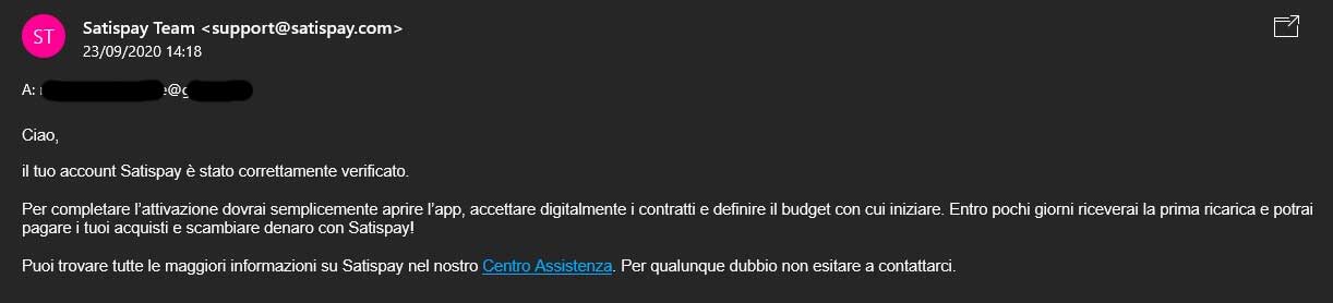 ATTENZIONE: anche una volta ricevuta la email seguente, relativa all’accettazione della tua utenza da parte di Satispay, come indicato nella stessa, è necessario “aprire l’app, accettare digitalmente i contratti e definire il budget con cui iniziare“.