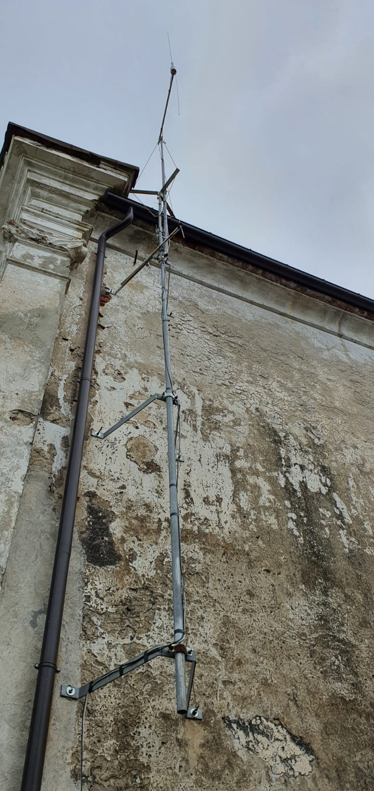 Fotografando dalle grate delle finestre frontali si scorge addirittura l’apparecchiatura a cui sicuramente tale antenna è collegata, con due led verdi ben visibili: sembrerebbe un ripetitore UHF tipo quelli per radio amatoriale, comunque non sicuramente utile per dialogare con una qualche entità divina! 🙄