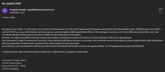 Da pass60@comune.torino.it ho ricevuto conferma che “la Civica Amministrazione sta verificando l’opportunità di estensione del periodo di fruizione della tessera PASS60 per gli aventi diritto nati nel 1959 che, a causa del lockdown non hanno potuto usufruire appieno delle opportunità offerte. A fine emergenza sanitaria, con l’avvio della ripresa lavorativa, sono stati contattati tutti gli Enti/Associazioni che hanno collaborato alla realizzazione del progetto.