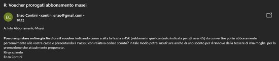 Una analoga gentile e cordiale risposta ho ricevuto contattando l’Associazione Abbonamenti Musei: “Buongiorno, in questo momento non può utilizzare il pass60, perché abbiamo sospeso le vendite e i rinnovi dell’abbonamento. Non si preoccupi che lo sconto scade il 31/12/2020. Alla riapertura dei musei verrà prorogata la possibilità di utilizzare il suo buono sconto“.