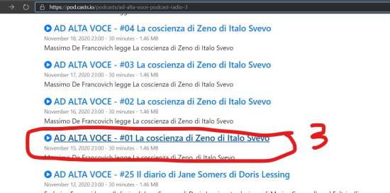 Da Pod.casts si seleziona il podcast d’interesse (e.g. la prima puntata della lettura del libro La coscienza di Zeno) e si copia l’URL relativo a esso (facendo click con il tasto destro e selezionando Copia collegamento).