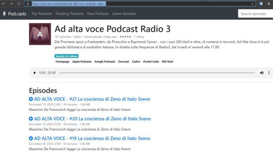 In Podcast italiani non sono presenti i podcast di Ad Alta Voce desiderati. In Apple Podcasts invece sì: infatti, andando anche nel sito ApplePodcasts si ritrova proprio quello relativo Ad Alta Voce, sebbene contenga solo 56 episodi e quindi solo i podcast relativi alle ultime puntate.