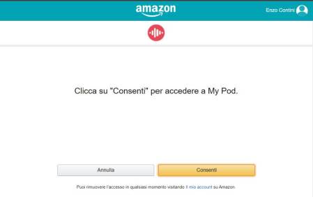 Dopo avere premuto il tasto Get started now (Inizia ora), viene chiesto di autenticarsi in Amazon e di avviare una procedura per collegare quello skill alle impostazioni che da quel sito web si effettueranno. Le volte successive verrà chiesto unicamente di consentire tale collegamento e viene specificato che “Puoi rimuovere l’accesso in qualsiasi momento visitando Il mio account su Amazon“.
