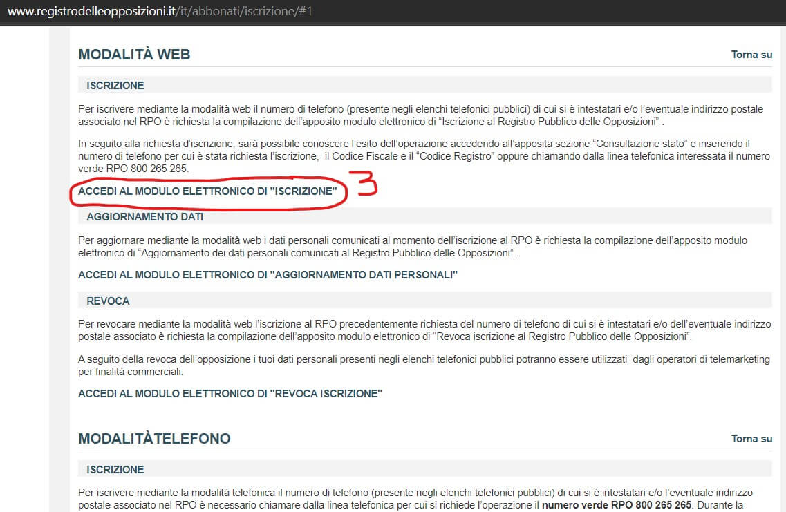 Sembra infatti che solo per il numero di telefono fisso uno può, almeno in teoria, appellarsi al Registro Pubblico delle Opposizioni, un servizio patrocinato dal Ministero dello Sviluppo Economico che, appunto, consente a chiunque di richiedere la rimozione del proprio numero dalla disponibilità degli operatori dei call center, pur mantenendolo nell’elenco telefonico pubblico. La procedura d’iscrizione del proprio numero telefonico fisso in questo registro è assai agevole soprattutto qualora si effettui via Web. Gli screenshot seguenti mostrano la semplice procedura passo-passo: