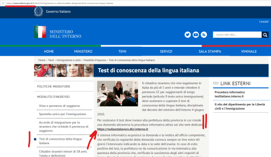 Andando quindi con il mio PC nel portale delle Prefetture-UTG (prefettura.it)), scegliendo la Regione, la Provincia e quindi dal menù la sua sezione Immigrazione, ero arrivato a un link relativo al Test di lingua italiana che a sua volta portava a un’ulteriore pagina di dettaglio dove esisteva un link analogo ma che puntava a un altro portale, quello del Ministero dell’Interno.