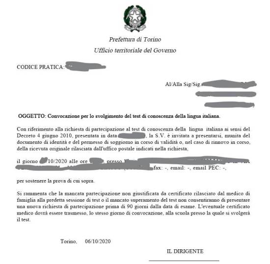 A quel punto, mi sono recato quindi personalmente alla Prefettura di Piazza Castello chiedendo di poter parlare con qualcuno relativamente appunto a quei test sulla conoscenza dell’italiano. Per fortuna ho trovato un’addetta molto gentile che, compresa la situazione, mi ha fornito personalmente il documento di convocazione da presentare all’atto dell’esame dove era presente anche l’informazione sulla nuova data e luogo di svolgimento. Quell’addetta, seppur assai gentile, mi aveva confessato che non ero il primo ad averle detto di aver avuto problemi a inoltrare personalmente la domanda per effettuare quel test di conoscenza dell’italiano, una volta autenticato in quel portale come privato cittadino, … ma dal momento che si trattava di un problema centralizzato sembrava che nessuno si fosse preoccupato più di tanto di quell’anomalia, seppure complicasse di molto la procedura che l’immigrato doveva effettuare! 🙄