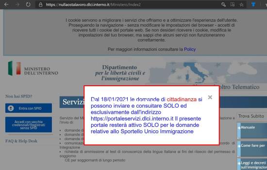 P.S. – Ho provato ora ad accedere al medesimo sito https://nullaostalavoro.dlci.interno.it: ora viene subito fornita al seguente indicazione che, secondo me, è un’ulteriore conferma di come tutti questi portali non siano integrati tra loro e si debba saltare da uno all’altro per poter trovare la gestione di servizi relativi a un medesimo contesto ben specifico, in questo caso l’immigrazione.