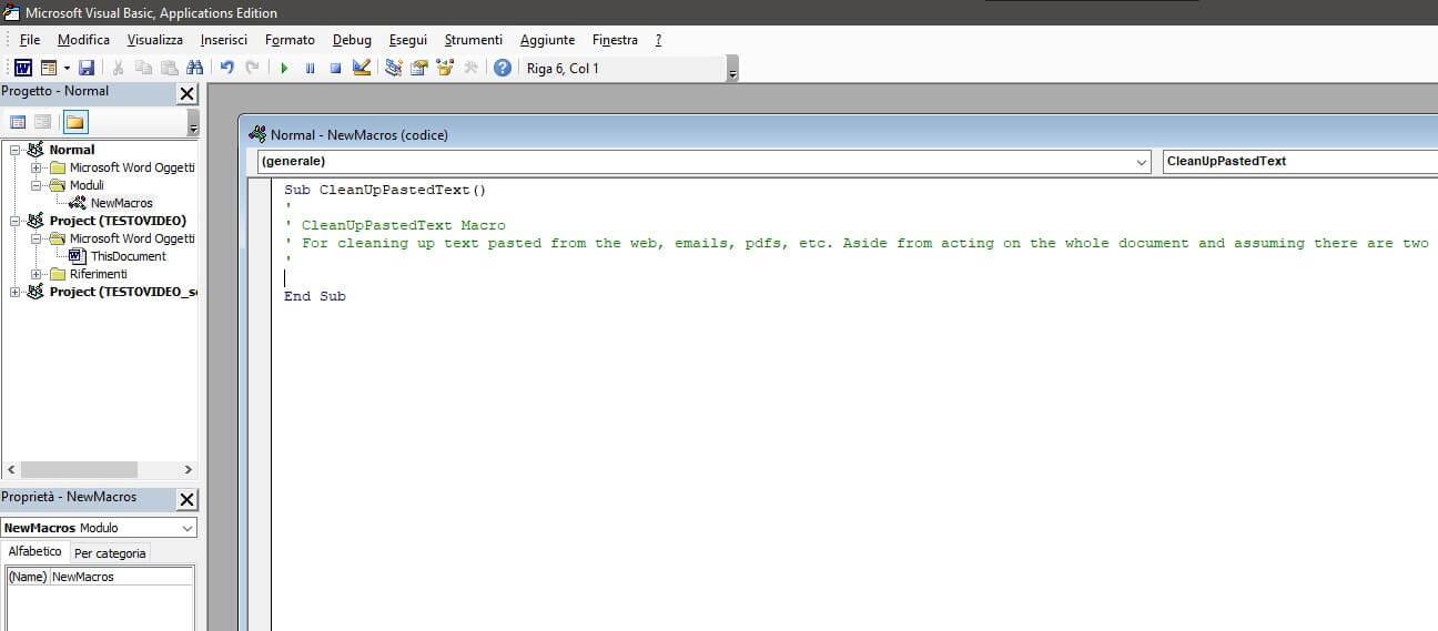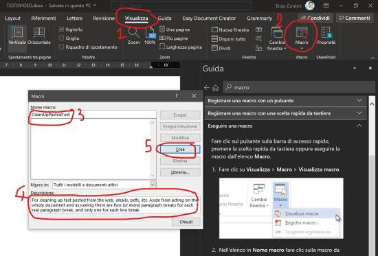 In questo caso specifico un’ottima macro l’ho trovata in Cleaning up Text Pasted from Websites, E-mails, PDFs etc. (msofficeforums.com) per cui basta copiarla e andare a inserire quel codice nella creazione di una nuova macro che si può poi richiamare dal proprio Word.