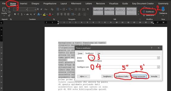 Per fortuna esiste la possibilità in Word sia di utilizzare la funzionalità Sostituisci che appunto modifica del testo in un altro, con anche la possibilità di effettuare tale sostituzione per tutto il documento (Sostituisci tutto) – o per quella parte eventualmente selezionata – , dopo magari avere provato prima con una singola sostituzione!