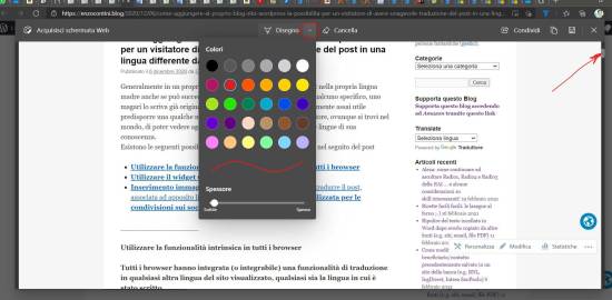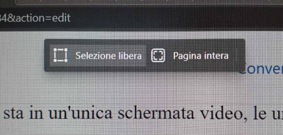 È quindi sufficiente selezionare dal menù in alto a destra […] di quel browser la voce Acquisisci schermata web per avere sullo schermo, leggermente scurito, due possibili opzioni: Selezione libera oppure Pagina intera. Con la prima opzione viene catturata per intero tutta la pagina del sito web, anche se molto lunga. Con la seconda opzione compare un riquadro di selezione rettangolare (con i margini tratteggiati) che può essere esteso anche oltre le dimensioni del testo attualmente visualizzato a video, consentendo così di catturare le parti della pagina del sito che si desiderano.