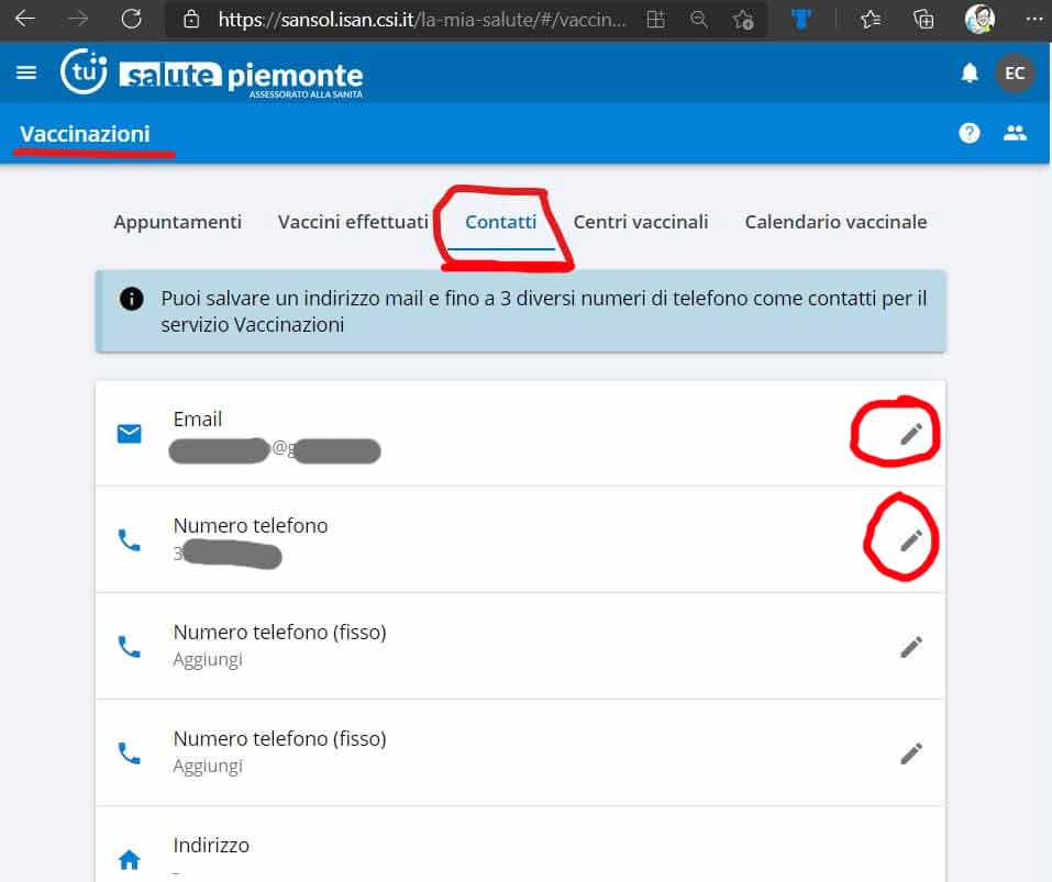Andando poi su www.sistemapiemonte.it, nella sezione servizi ai cittadini, e autenticandosi con SPID/Carta d’identità Elettronica (CIE)/Credenziali Sistema Piemonte o Torino Facile, si accede al sito Servizionline (regione.piemonte.it) e in particolare nella sua sezione relativa alle vaccinazioni dove si possono sia visualizzare tutte quelle già effettuate sia eventualmente vedere quelle programmate. Conviene poi, già che uno c’è, registrare i propri contatti (email e numero di cellulare, per eventualmente ricevere notifiche relative alla sanità: si noti che si può indicare email e numero di cellulare sia dall’iconcina di campanella in alto a destra, per qualsiasi comunicazione, sia nel tab dei contatti relativa alla sezione delle vaccinazioni. Senza saper ne leggere ne scrivere, io ho inserito i miei dati in entrambe le sezioni … anche se si deve ripetere la noiosa, seppur necessaria, procedura di verifica sia del numero telefonico sia della email!