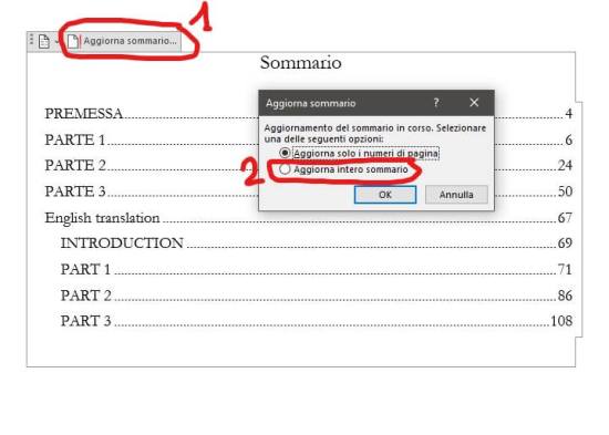 Anche se esula un po’ dal contesto di questo post, ricordo l’importanza d’inserire un indice nel proprio libro … uno vero che si possa aggiornare automaticamente se si cambia l’impaginazione e/o si aggiungono tolgono/spostano parti del testo. Tutti gli editor infatti consentono di definire dei titoli di diverso livello e quindi inserire una sezione di sommario che faccia riferimento a quelli e che si possa aggiornare semplicemente cliccandoci sopra e selezionando di aggiornarlo:
