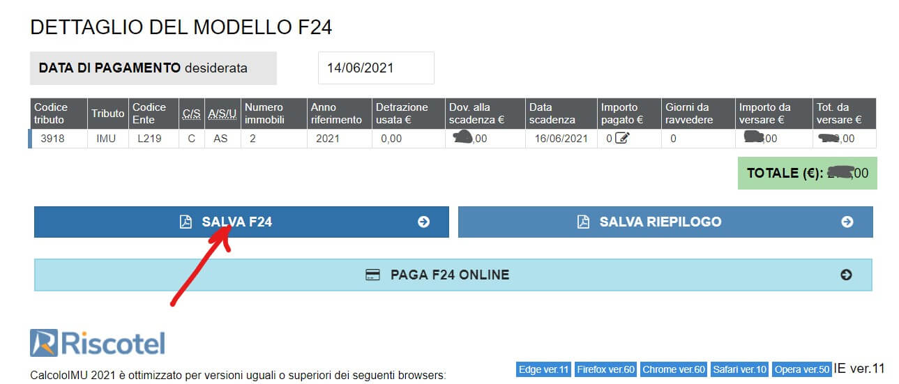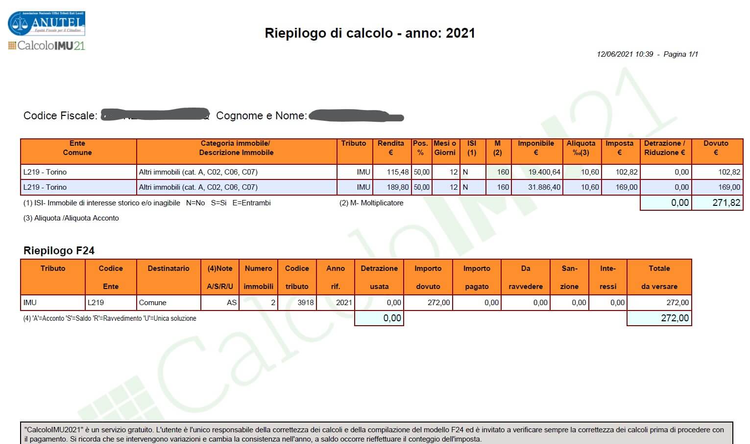 Una volta terminato l’inserimento di tutti dati richiesti, tra cui essenziali sono la quota di possesso e la rendita catastale (che uno può trovare ad esempio nell’atto di acquisto o dall’Agenzia delle Entrate chiedendo la propria Visura per soggetto), premendo il tasto verde Calcola viene appunto calcolato l’importo dovuto per quell’immobile:
