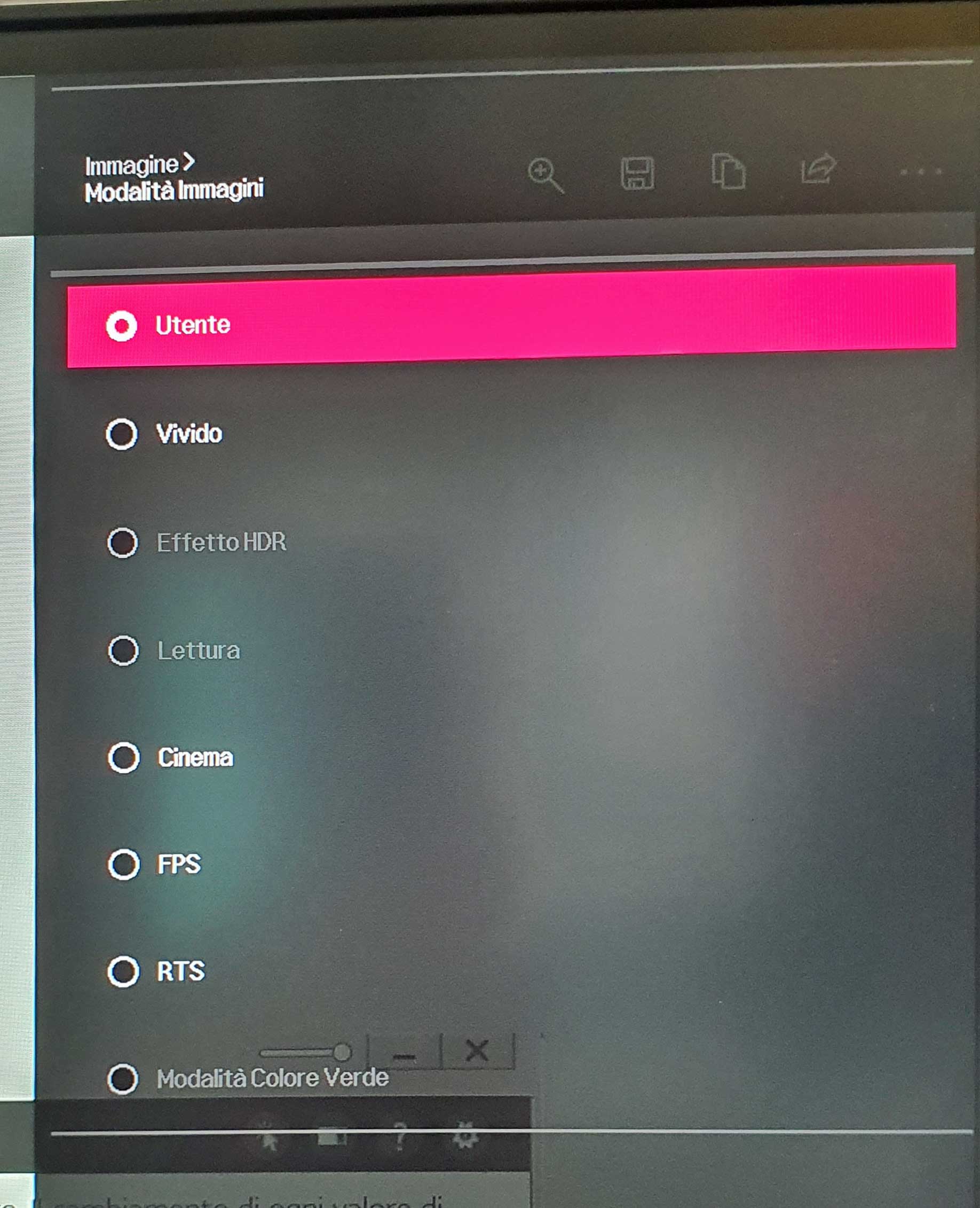 Ho notato poi che anche nelle impostazioni di configurazione del monitor stesso, disponibili premendo il tasto sul margine inferiore, alcune Modalità Immagini non erano selezionabili (i.e. Effetto HDR, Lettura, Modalità Colore Verde).