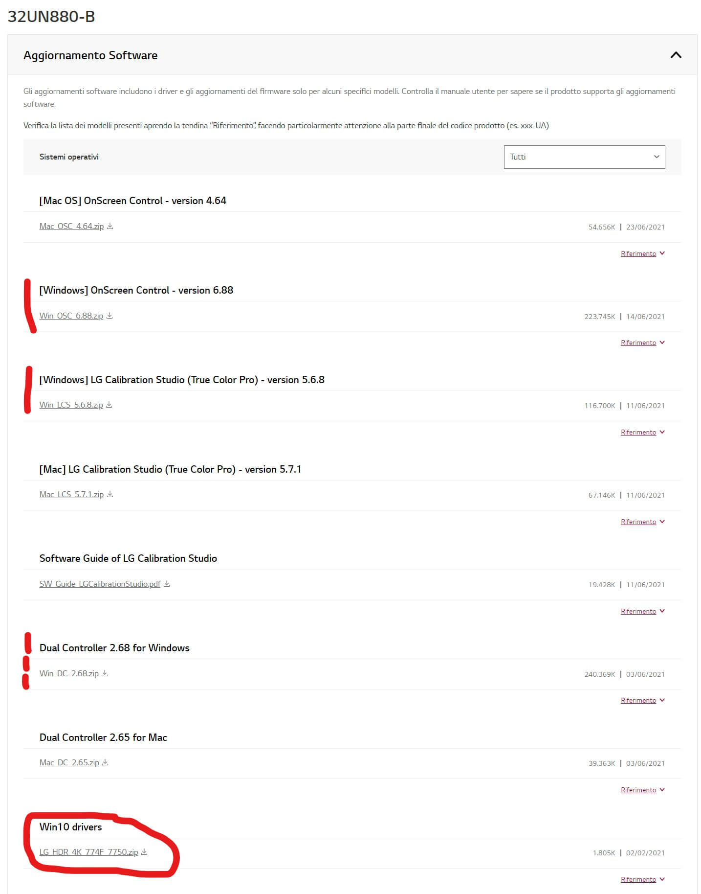 Si noti che, per ciascun SW elencato per quel prodotto, premendo il link Riferimento, in alto a destra, viene visualizzata una descrizione sintetica di cosa serve. Ad esempio, per il SW Dual Controller viene indicato: “Dual Controller è un software applicativo che consente all’utente di controllare più sistemi Windows e Mac utilizzando la tastiera e il mouse condivisi collegati a un computer. È progettato per le persone che spesso usano più di un sistema che sono posizionati uno vicino all’altro. Con il software dual controller, l’utente può condividere una singola tastiera/mouse su un set di sistemi (Windows/MAC)“. Non avendo questa esigenza, quello è l’unico SW che non ho installato, mentre ho utilizzato gli altri [OnScreen Control, LG Calibration Studio (True Color Pro)], oltre ovviamente il driver.