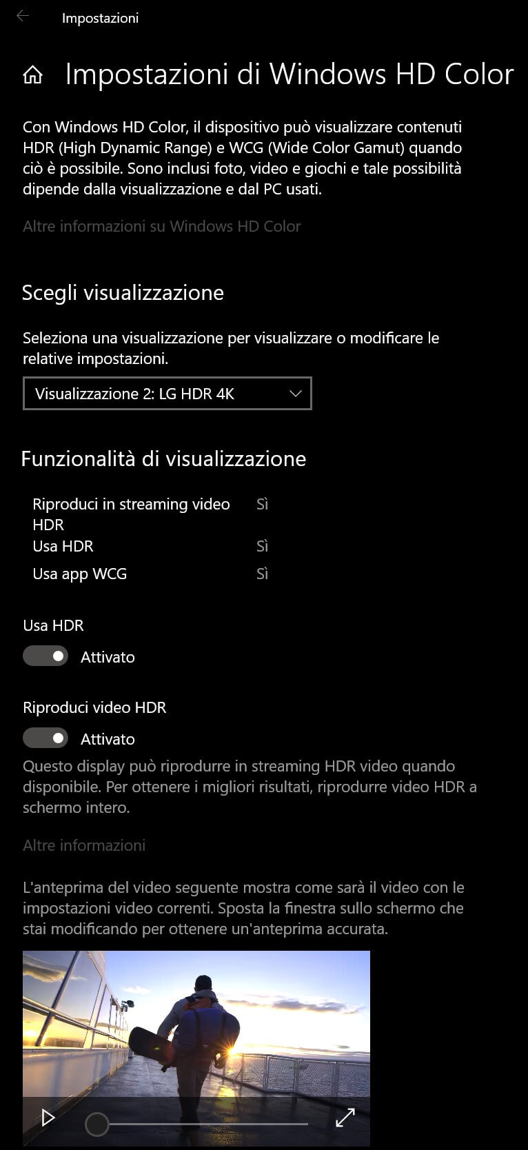Se uno infatti su Windows 10 toglie la visualizzazione in HDR (interruttore Usa HDR disattivato, generalmente è attivo di default), per il monitor LG HDR 4K, le Modalità Immagini che il suo menù propone vengono tutte attivate e sono molteplici: