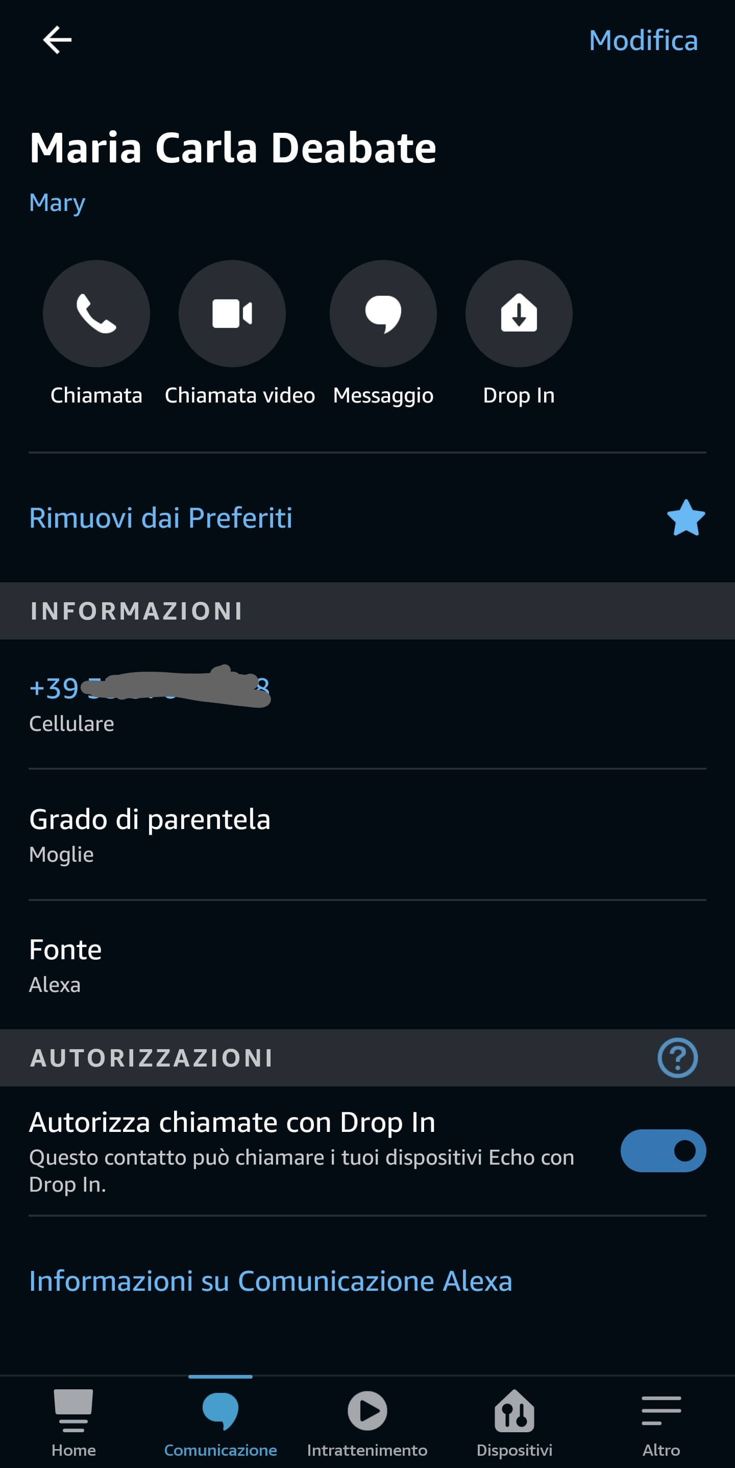 Si noti che a seconda della tipologia di contatto – se inserito a mano, importato da Skype, dallo smartphone, o sia un dispositivo Echo di una specifica tipologia – le modalità di comunicazione disponibili possono risultare differenti. Ad esempio, su un Echo Dot si può solo effettuare una chiamata o un Drop In, mentre per un contatto di fonte Alexa si possono anche effettuare videochiamate e invio di messaggi: