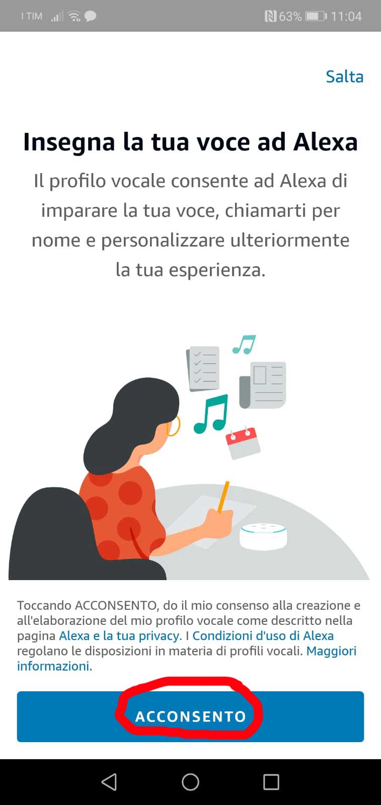 Una configurazione personale dell’app consente inoltre d’impostare al meglio anche il riconoscimento del parlato in modo che Alexa comprenda meglio i comandi impartiti dalla persona: tale configurazione prevede la lettura di quattro comandi che si possono impartire ad Alexa, in modo che capisca meglio la propria personale pronuncia: