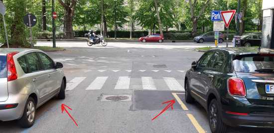 Inutile poi era risultata la mia successiva email – a cui non ho mai ricevuto risposta – in cui mostravo (semmai ce ne fosse stata necessità!) situazioni analoghe in Torino in cui parcheggi anche a strisce blu e gialle arrivavano fino alle strisce pedonali nei pressi di un incrocio (sicuramente assai più trafficati di quello in oggetto di via Pergolesi!).