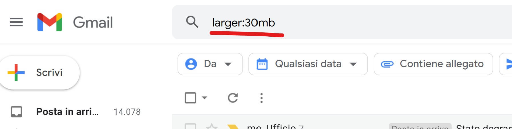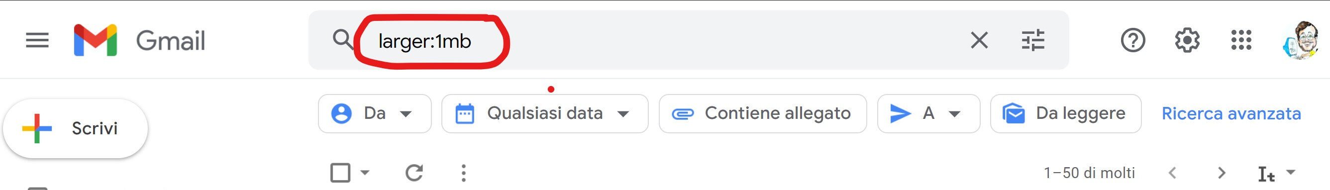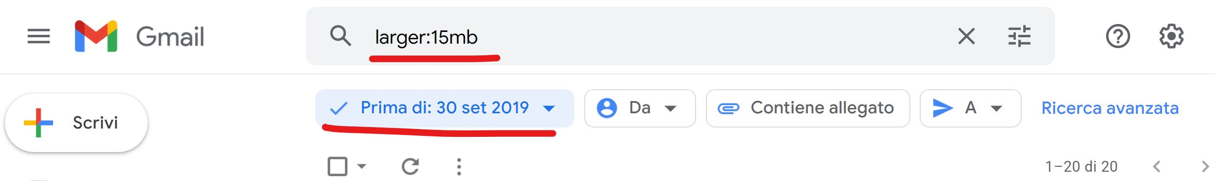Può essere importante anche individuare le email che rubano più spazio in quanto solo eliminando quelle, qualora non servano più (salvando eventualmente localmente qualche loro allegato), si potrà sostanzialmente liberare molto spazio. Si può quindi incominciare a effettuare un filtraggio sulle dimensioni partendo, ad esempio, da quelle di più di 30mb (larger:30mb) per poi ridurre le dimensioni (e.g. larger:15mb, larger:5mb, larger:1mb) nei filtraggi successivi per individuarne altre email comunque “pesanti”. Purtroppo non è possibile indicare maggiore di e minore di per ridurre l’intervallo e non avere elencate anche quelle email di dimensioni più elevate che già si erano tenute nel filtraggio precedente…
