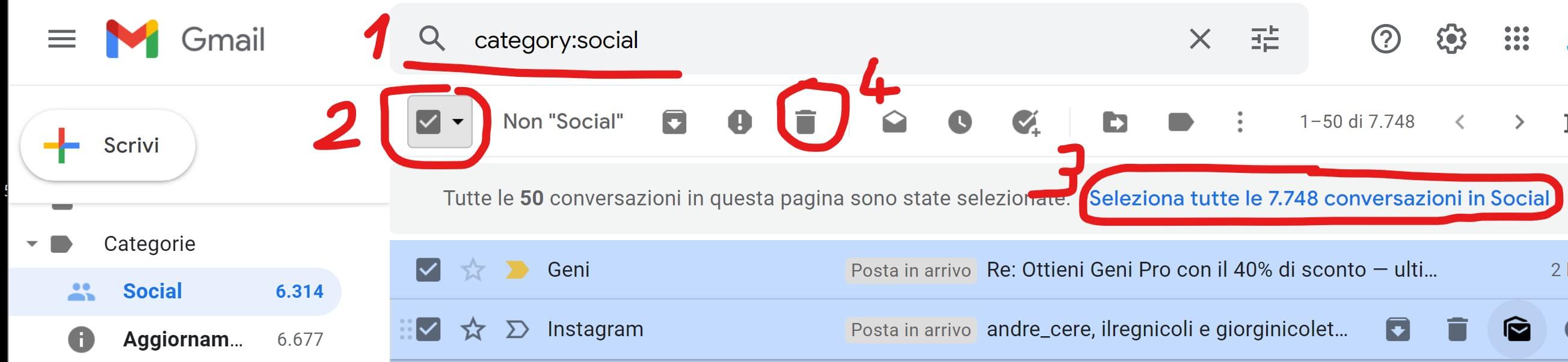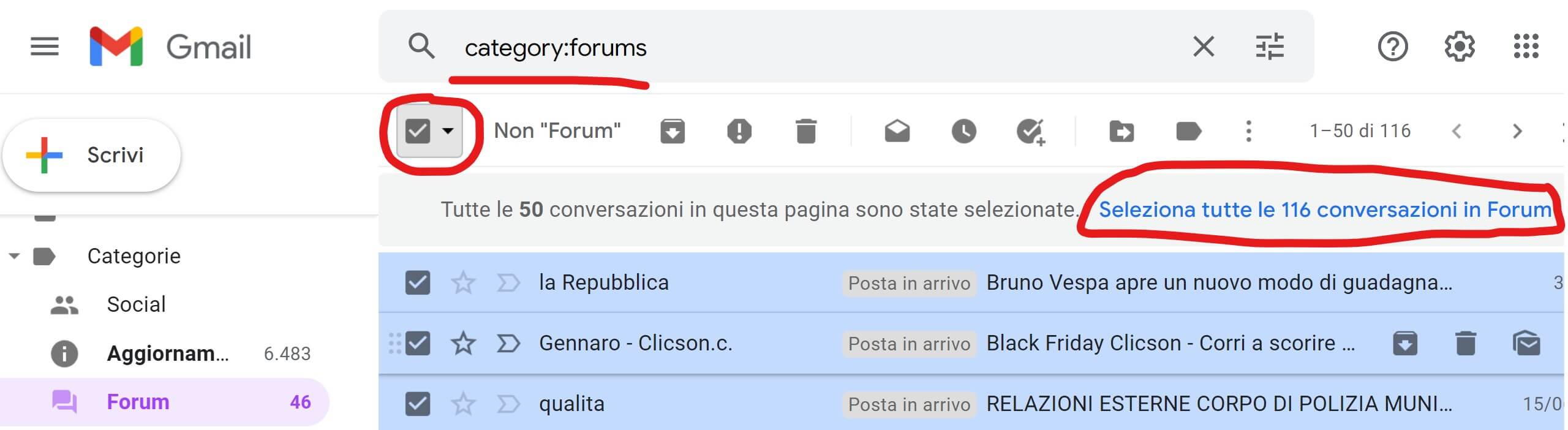 La prima cosa da fare può essere quella di spostare nel cestino tutte le email catalogate come Promozioni. Per far questo basta andare dal menù a sinistra su Promozioni, cliccare nel quadratino di selezione in alto che seleziona tutte le email di quella pagina, premere anche il link Seleziona tutte le xxxx conversazioni in Promozioni e infine premere l’icona del cestino. In questo modo si eliminano tutte le email di quella categoria, anche se sono moltissime e quindi mostrate su più pagine: se non si preme quel link Seleziona tutte le xxx conversazioni in yyyy, verrebbero cancellate solo le poche decine di email (e.g. 50) visualizzate in quella pagina e per cancellare le altre si dovrebbe andare, di volta in volta, nella pagina successiva premendo il > in alto a destra (nell’esempio mostrato nella figura seguente, ci sono ben 27495 pagine di 50 mail ciascuna!!!).