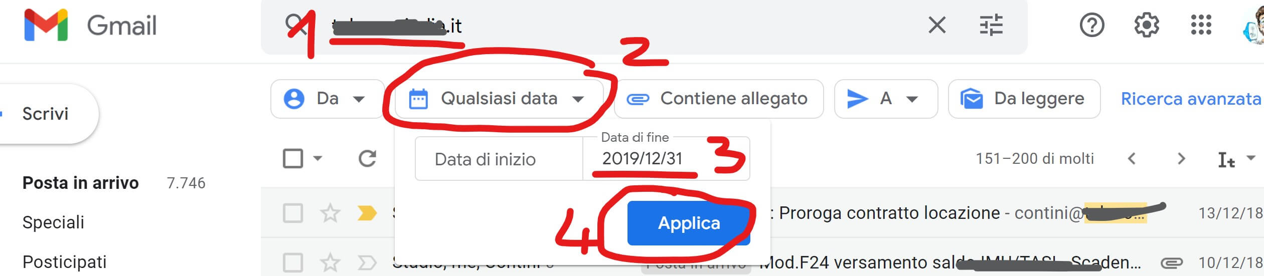 Si può poi effettuare filtraggi di altro tipo secondo la propria sensibilità, ad esempio quelli sulla data (dal momento che probabilmente le mail più vecchie possono risultare di minore interesse rispetto a quelle più recenti – e.g. degli ultimi anni) o effettuando una ricerca avanzata indicando, ad esempio anche più di un mittente: