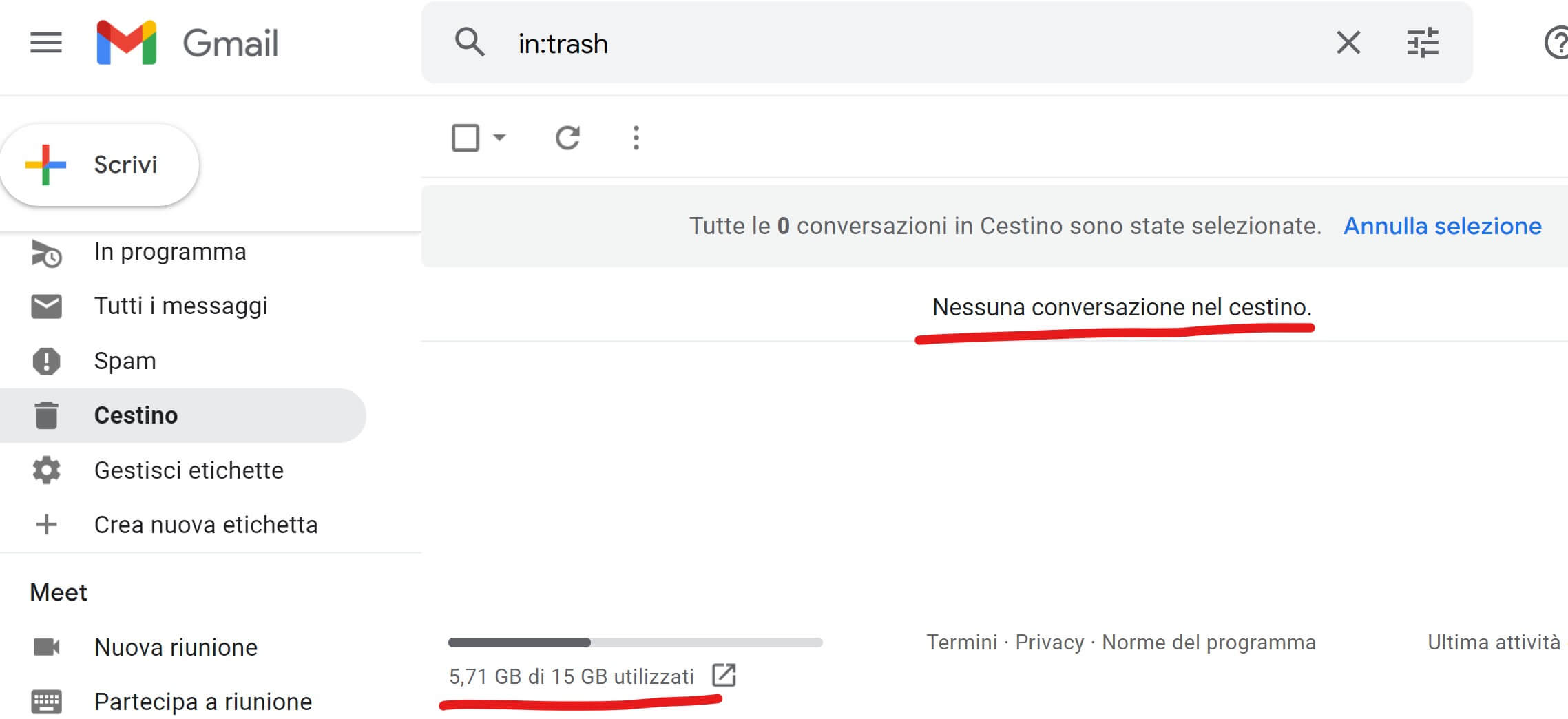 È quindi essenziale selezionare il Cestino (premendo Altro per visualizzarlo trovandosi in basso nell’elenco a sinistra), selezionare il solito quadratino di selezione delle email mostrate nella pagina, cliccare sul link Seleziona tutte le xxxx conversazioni in Cestino e infine premere Elimina definitivamente. Dopo avere così operato, in basso si può vedere una barra che mostra quanto spazio si è liberato (e.g. nell’esempio viene indicato 5,71GB di 15 GB utilizzati, per cui così operando ho liberato più di 8GB!).