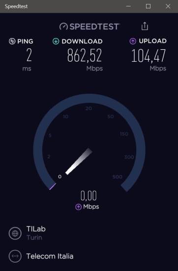 - 862,57 Mbps in download e 104,47 Mbps in upload con un collegamento di un PC via cavo direttamente alla presa ethernet del router.