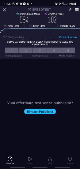 - 584 Mbps in download e 102 Mbps in upload con un collegamento di uno smartphone al Wi-Fi a 5GHz generato dal router stesso, rimanendo vicino a esso (e.g. nella medesima stanza dove è collocato il router).