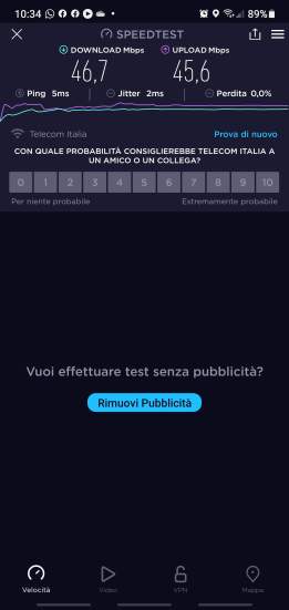 - 83,2 Mbps in download e 99,4 Mbps in upload con un collegamento di uno smartphone al Wi-Fi a 5GHz generato da un adattatore powerline (collocato in una presa elettrica di una stanza molto distante dal router), rimanendo nella stessa stanza in cui è posizionato quel dispositivo di rete.