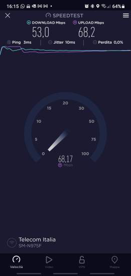 - 53 Mbps in download e 68 Mbps in upload con un collegamento di uno smartphone al Wi-Fi a 2,4GHz generato dal router stesso pur rimanendo con lo smartphone vicino a esso (e.g. nella medesima stanza dove è stato collocato il router anche se, in questo caso, si sarebbe avuto un risultato di poco peggiore anche spostandosi in una stanza accanto)